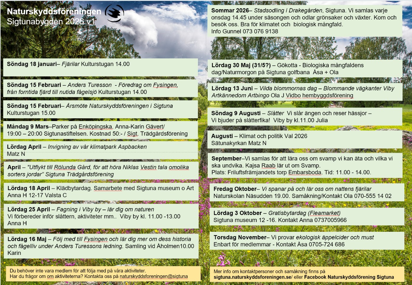 Naturskyddsföreningen i Sigtunabygden är en lokalavdelning av Sveriges största miljöorganisation. Vi vill inspirera dig genom naturupplevelser, föreläsningar och temadagar, peppa dig som konsument att göra klimatsmarta val och gärna ha med oss din röst när vi för klimatets talan genom politisk påverkan och debatt.